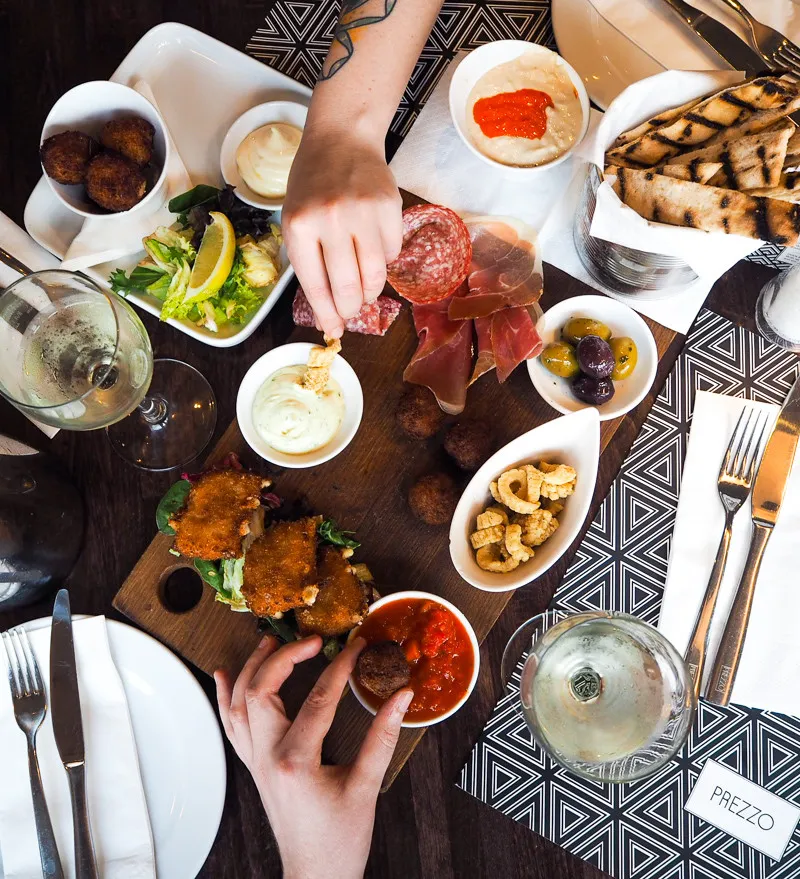 Prezzo’s sharing board at 15.00 loads prosciutto, pepperoni, mozzarella, peppers, tomatoes, rocket, olives, focaccia. Calamari at 9.25 or large for 12.75 offers crispy rings, tangy dip. These round openers, priming pasta dives.